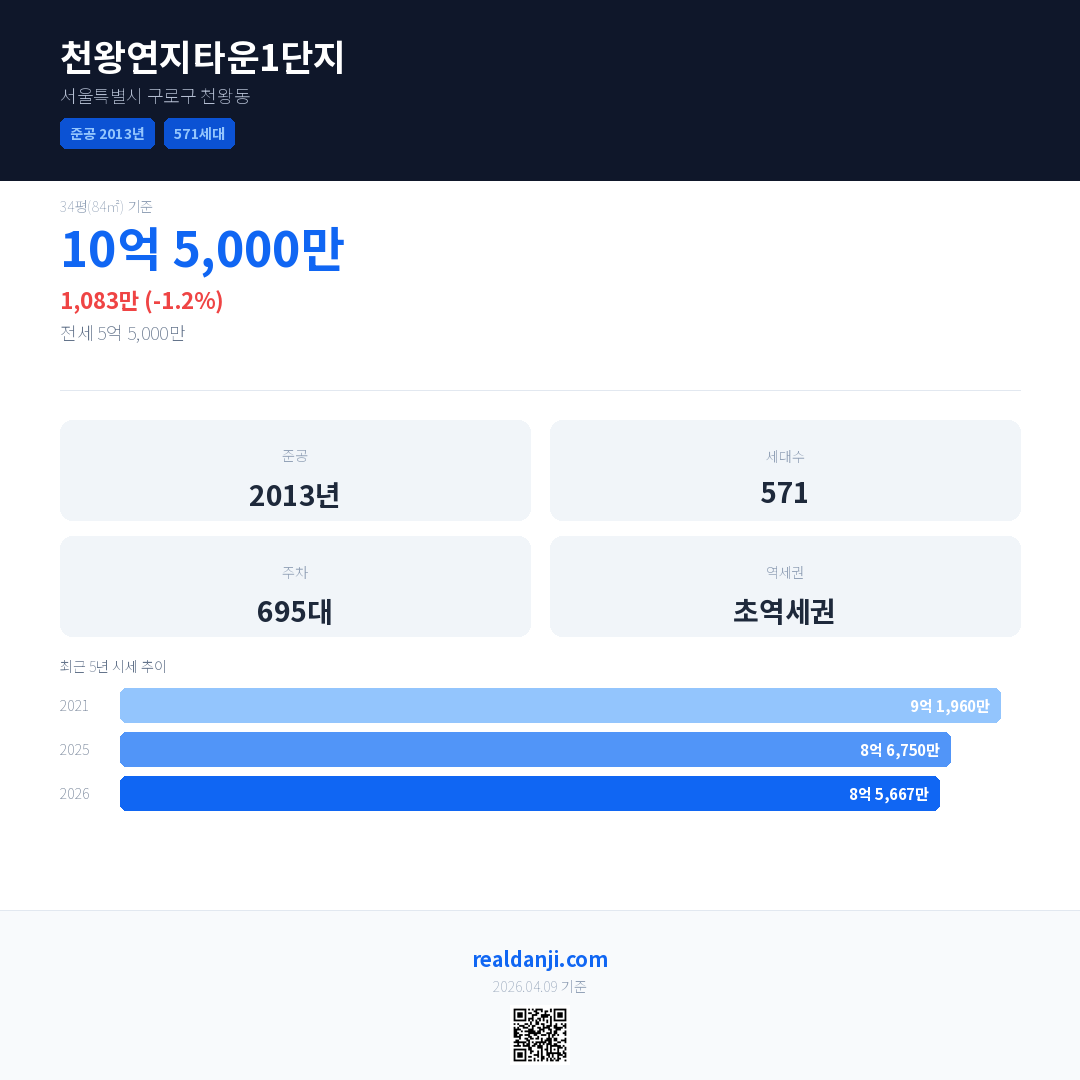 천왕연지타운1단지 최근 거래가는 10억 5,000만입니다. (2026-03)