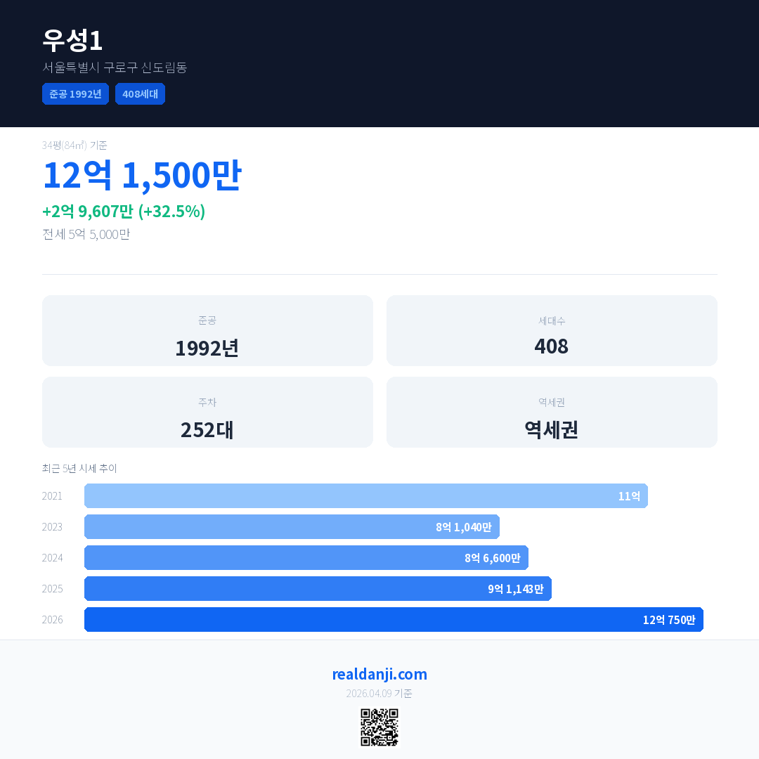 우성1 최근 거래가는 12억 1,500만입니다. (2026-02)