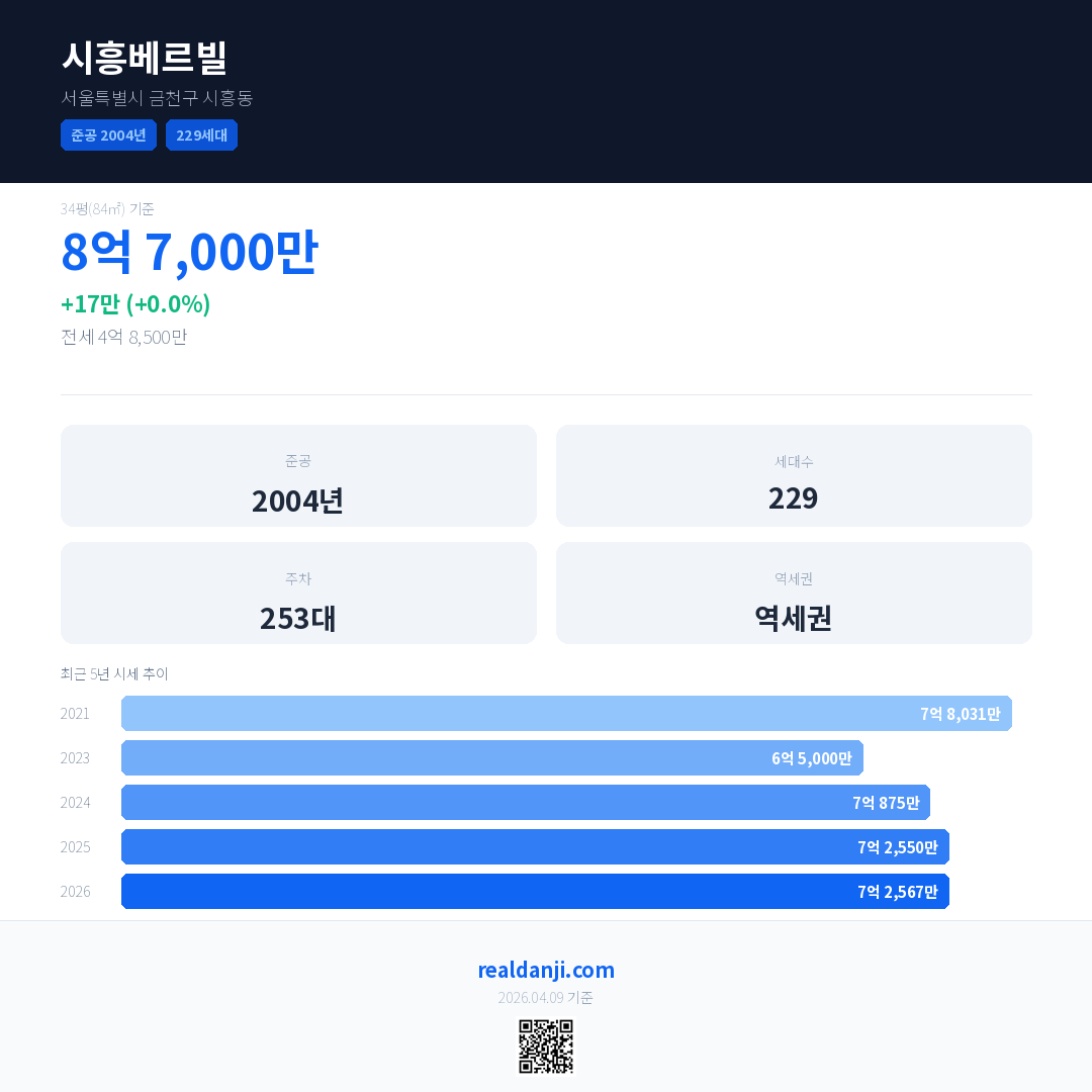 시흥베르빌 국민평형 기준 2026년 평균 거래가는 7억 2,567만으로, 전년 대비 0.0% 하락 했습니다.