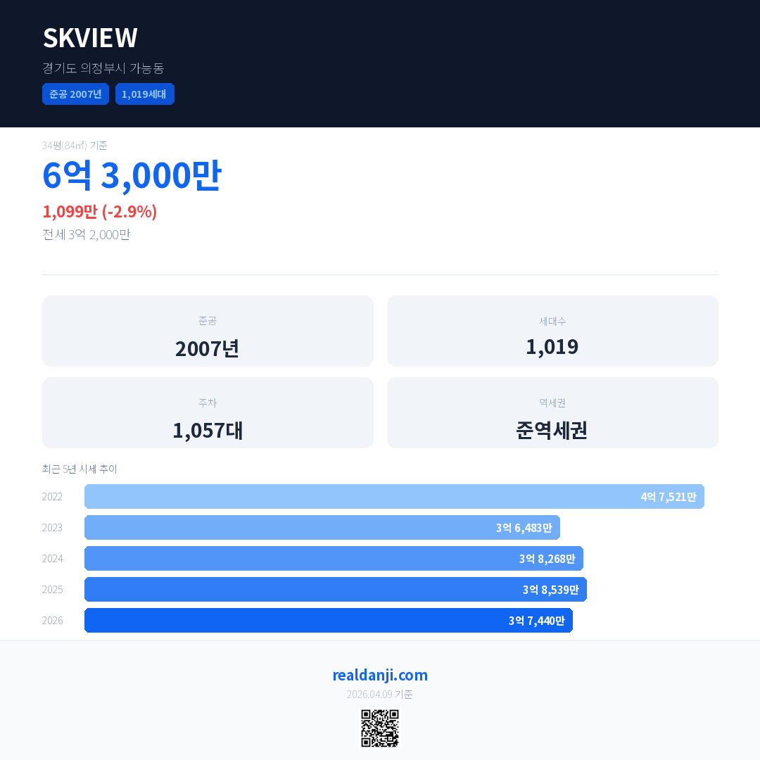 SKVIEW 최근 거래가는 6억 3,000만입니다. (2026-03)