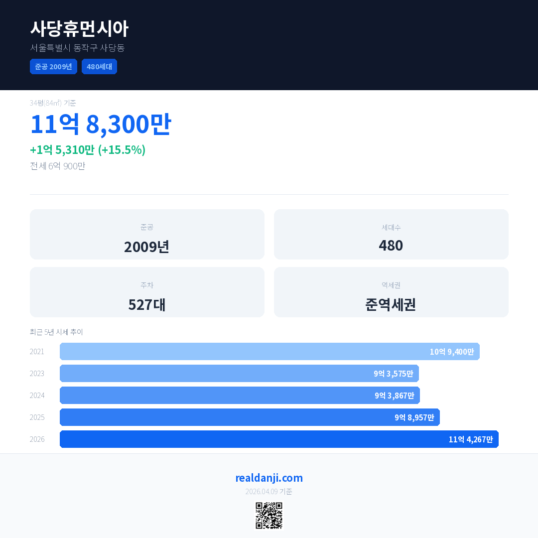 사당휴먼시아 국민평형 기준 2026년 평균 거래가는 11억 4,267만으로, 전년 대비 15.5% 상승 했습니다.