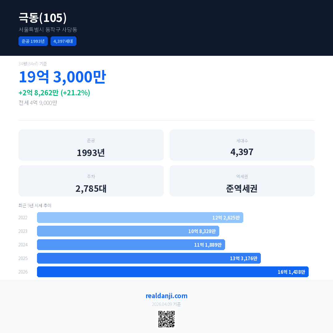 극동(105) 국민평형 기준 2026년 평균 거래가는 16억 1,438만으로, 전년 대비 21.2% 상승 했습니다.
