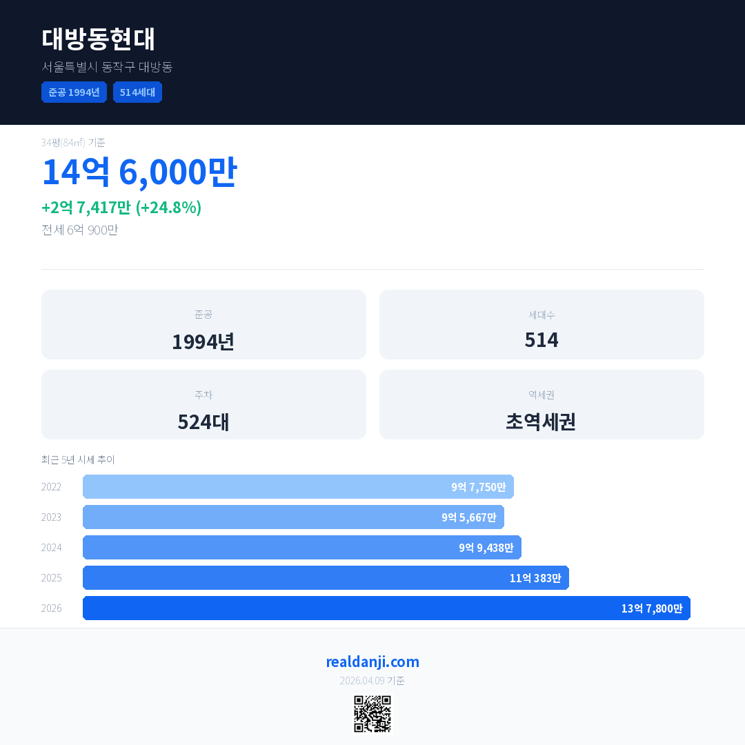 대방동현대 최근 거래가는 14억 6,000만입니다. (2026-02)