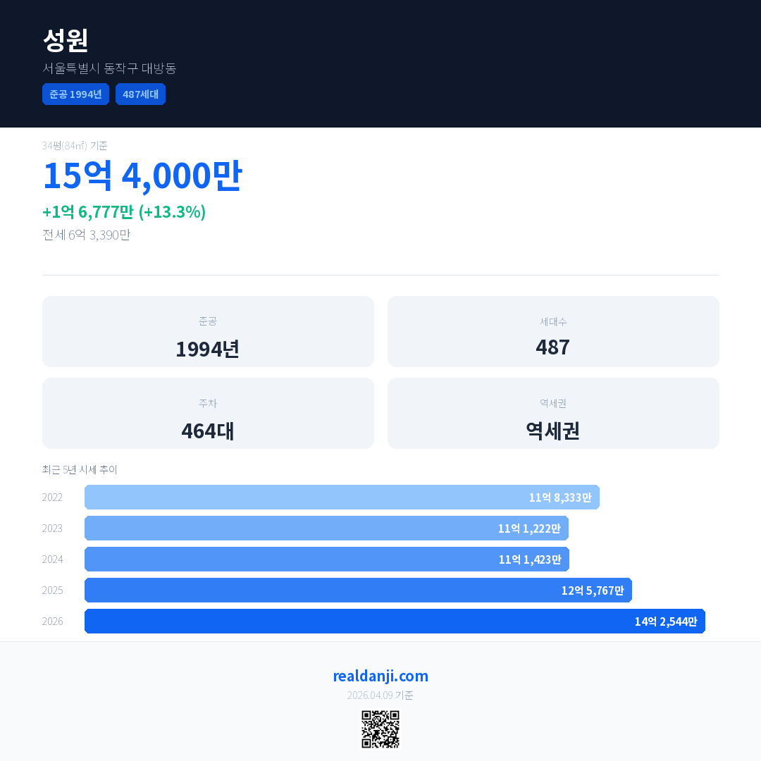 성원은(는) 1994년에 준공되었으며, 현재 32년차입니다. 총 487세대 규모입니다.