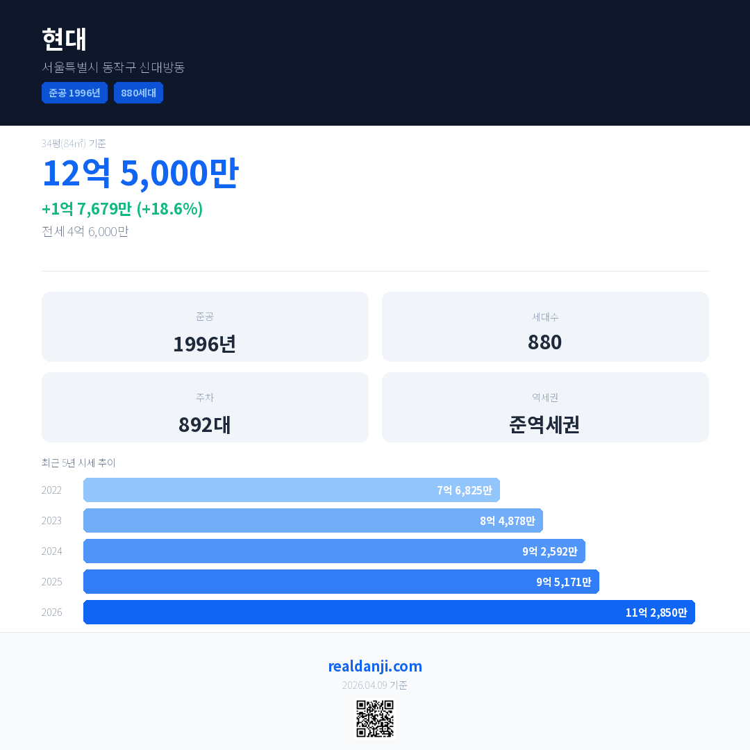 현대 국민평형 기준 2026년 평균 거래가는 11억 2,850만으로, 전년 대비 18.6% 상승 했습니다.