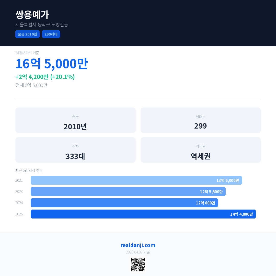 쌍용예가 국민평형 기준 2025년 평균 거래가는 14억 4,800만으로, 전년 대비 20.1% 상승 했습니다.