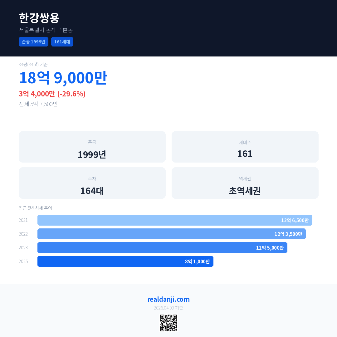한강쌍용 국민평형 기준 2025년 평균 거래가는 8억 1,000만으로, 전년 대비 29.6% 하락 했습니다.