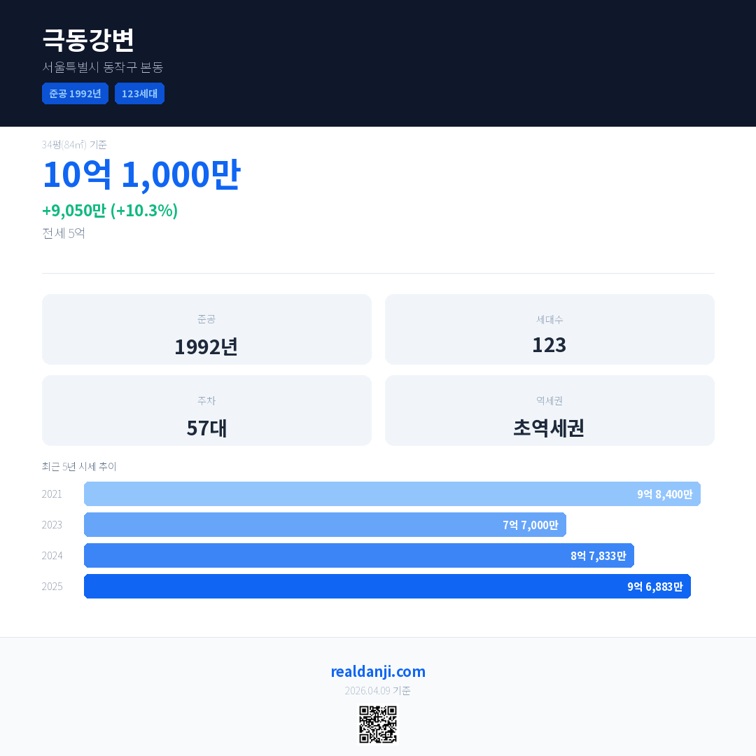 극동강변 국민평형 기준 2025년 평균 거래가는 9억 6,883만으로, 전년 대비 10.3% 상승 했습니다.