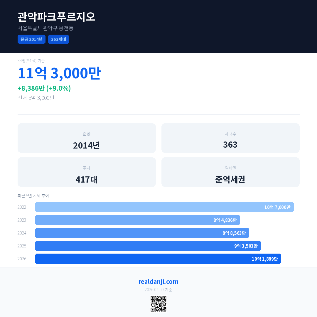 관악파크푸르지오 최근 거래가는 11억 3,000만입니다. (2026-03)