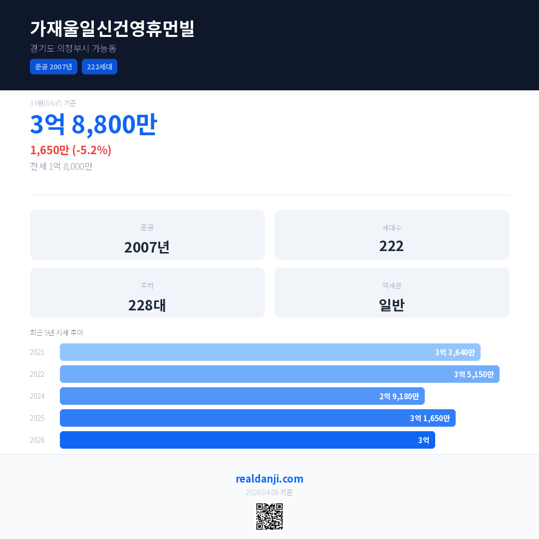 가재울일신건영휴먼빌 최근 거래가는 3억 8,800만입니다. (2026-03)