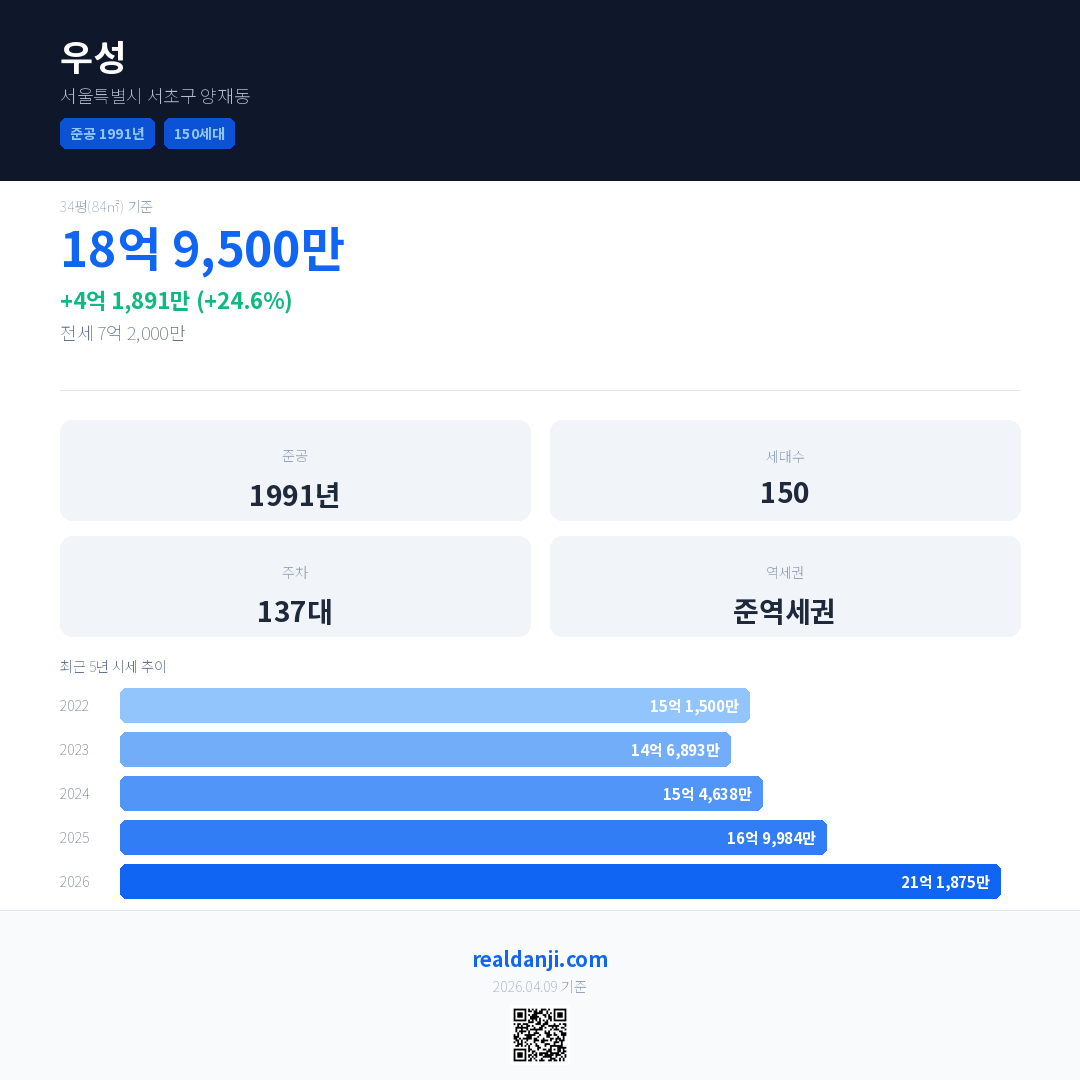 우성은(는) 1991년에 준공되었으며, 현재 35년차입니다. 총 150세대 규모입니다.