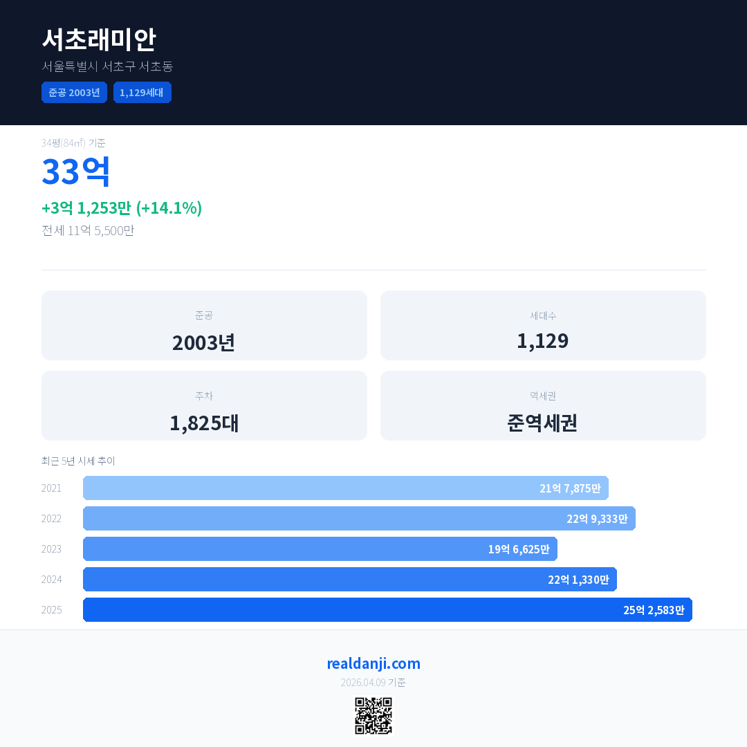 서초래미안 국민평형 기준 2025년 평균 거래가는 25억 2,583만으로, 전년 대비 14.1% 상승 했습니다.