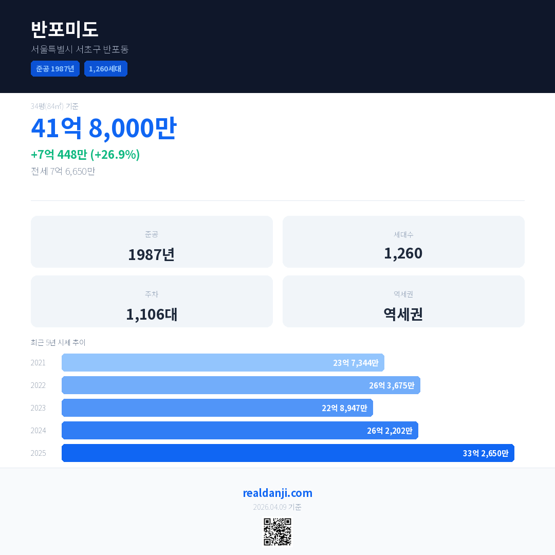 반포미도 국민평형 기준 2025년 평균 거래가는 33억 2,650만으로, 전년 대비 26.9% 상승 했습니다.