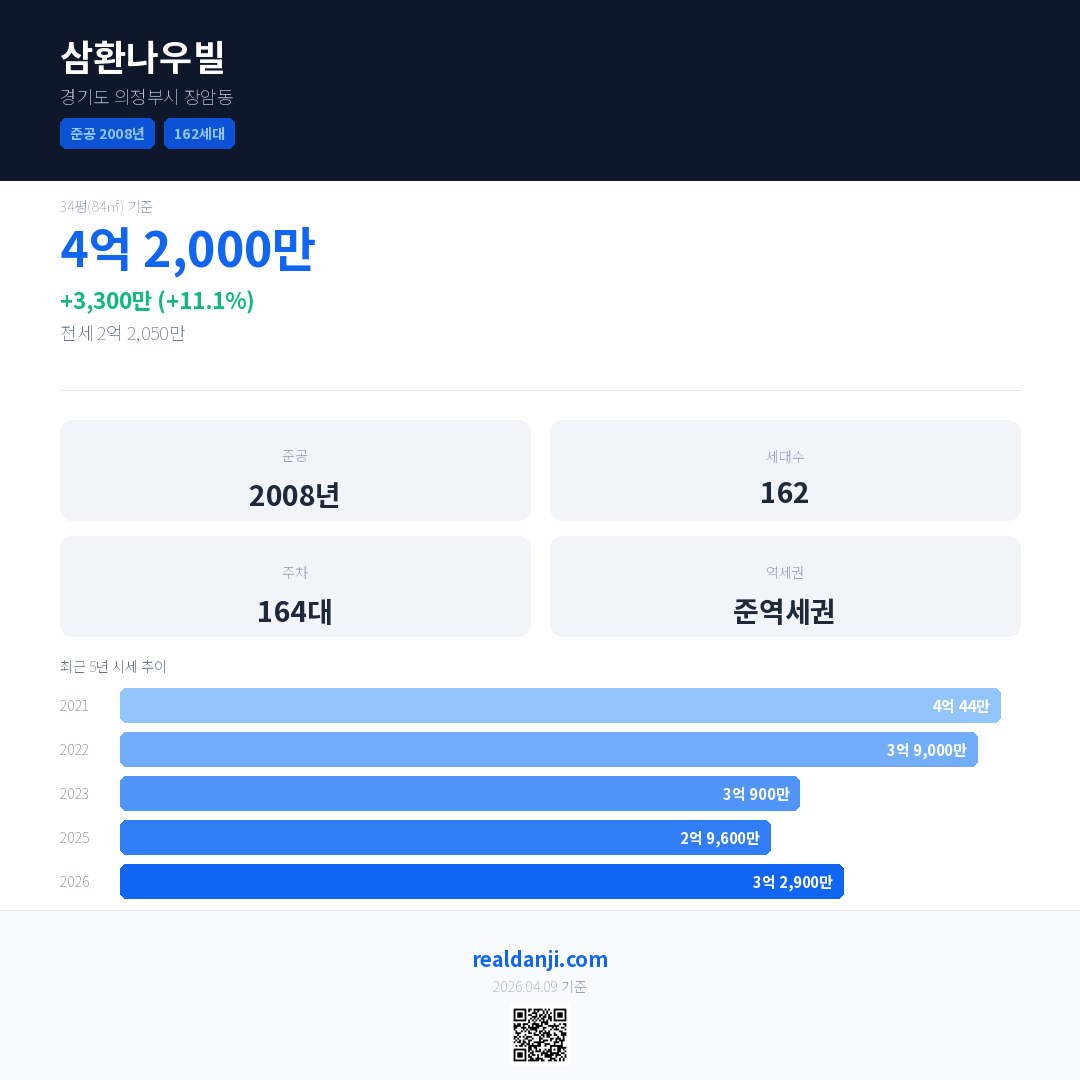 삼환나우빌 국민평형 기준 2026년 평균 거래가는 3억 2,900만으로, 전년 대비 11.1% 상승 했습니다.