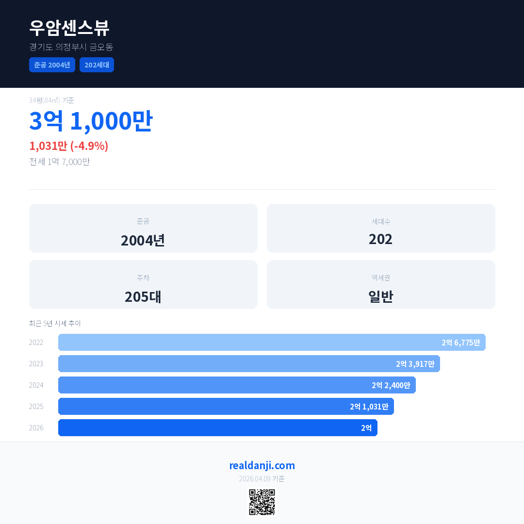 우암센스뷰 최근 거래가는 3억 1,000만입니다. (2026-01)