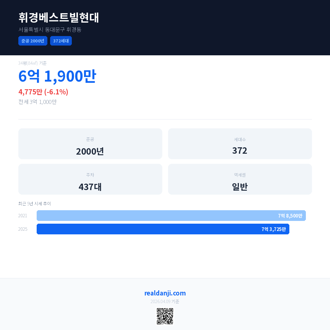휘경베스트빌현대 국민평형 기준 2025년 평균 거래가는 7억 3,725만으로, 전년 대비 6.1% 하락 했습니다.