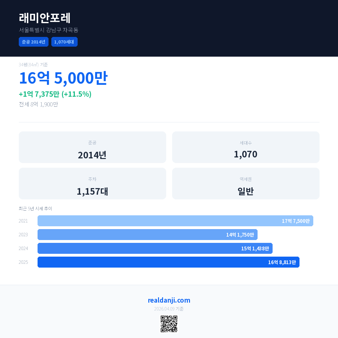 래미안포레 국민평형 기준 2025년 평균 거래가는 16억 8,813만으로, 전년 대비 11.5% 상승 했습니다.
