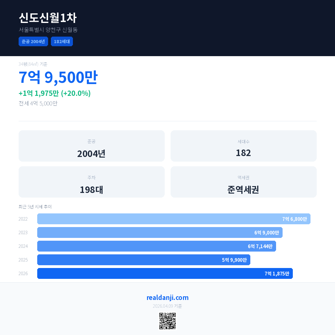 신도신월1차 국민평형 기준 2026년 평균 거래가는 7억 1,875만으로, 전년 대비 20.0% 상승 했습니다.