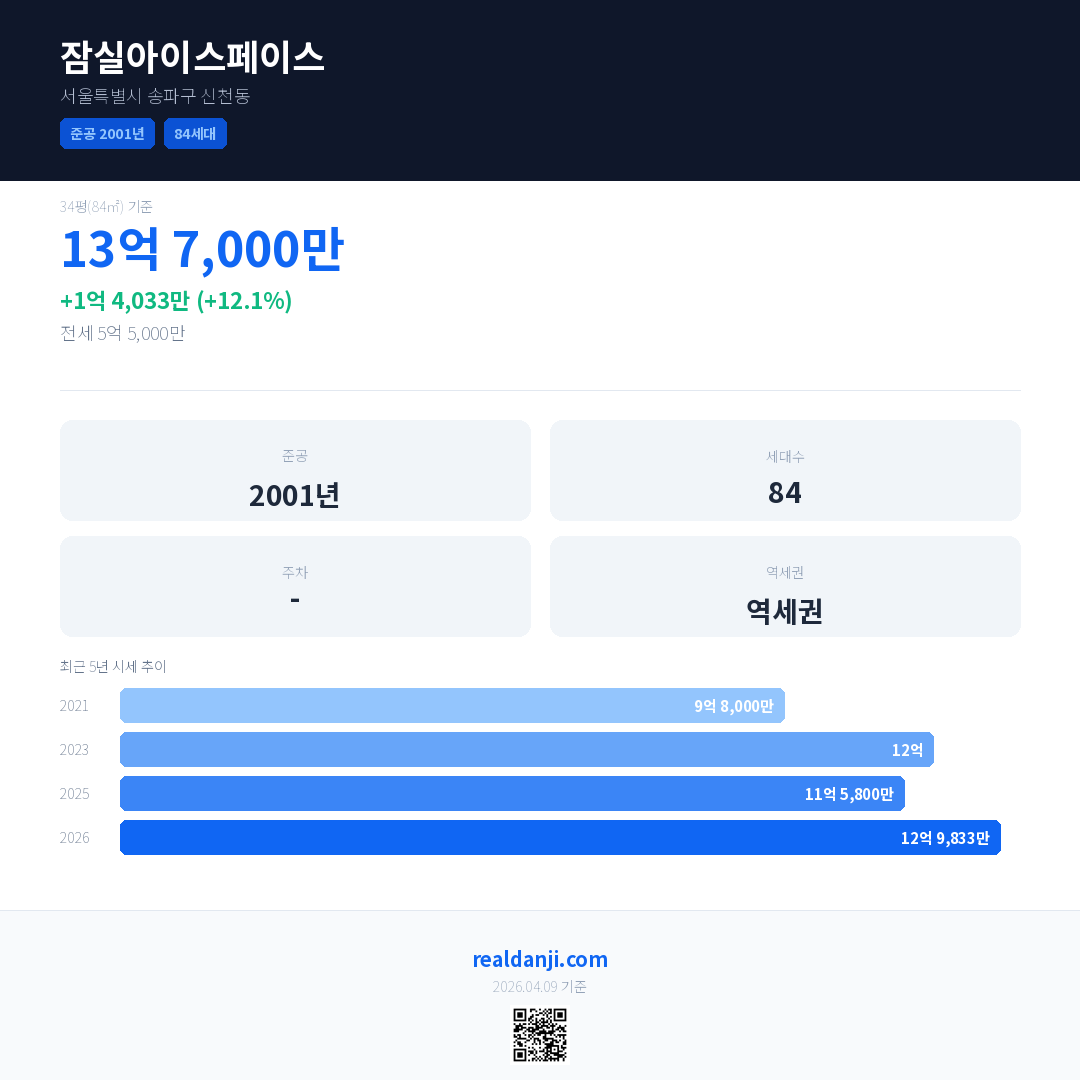 잠실아이스페이스 국민평형 기준 2026년 평균 거래가는 12억 9,833만으로, 전년 대비 12.1% 상승 했습니다.
