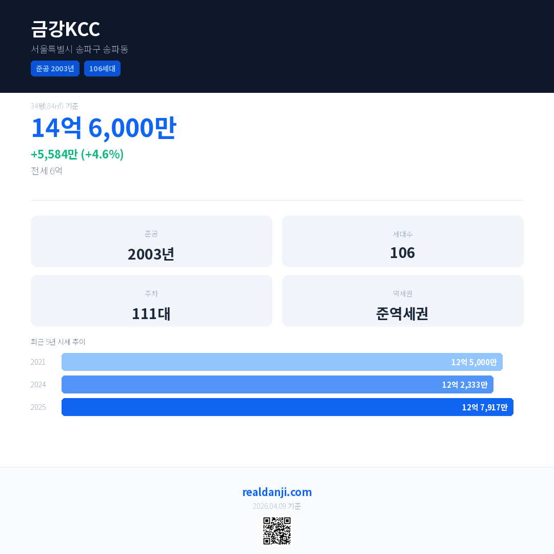 금강KCC 국민평형 기준 2025년 평균 거래가는 12억 7,917만으로, 전년 대비 4.6% 상승 했습니다.