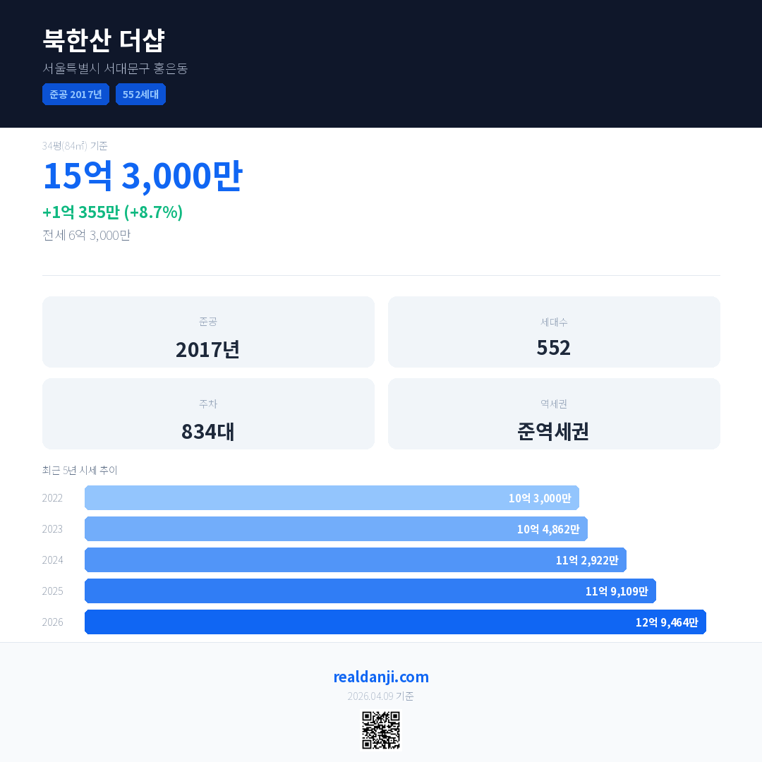 북한산 더샵은(는) 2017년에 준공되었으며, 현재 9년차입니다. 총 552세대 규모입니다.