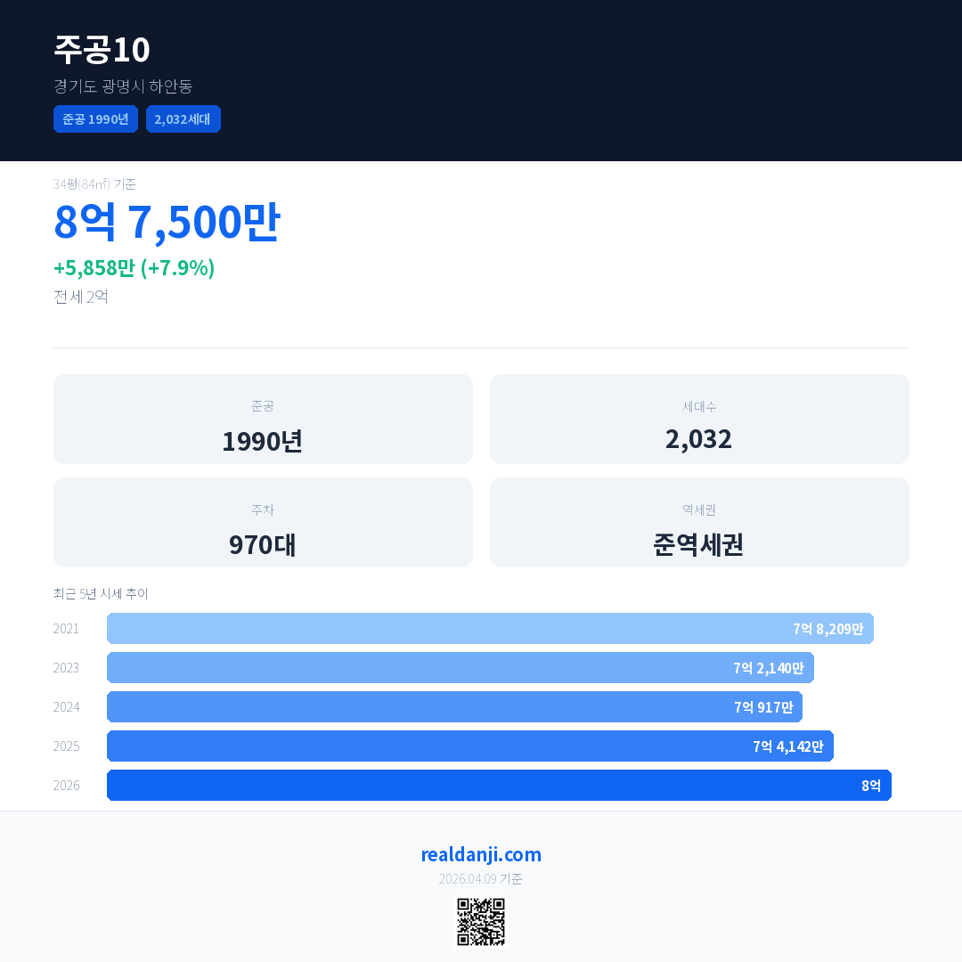 주공10 최근 거래가는 8억 7,500만입니다. (2026-03)