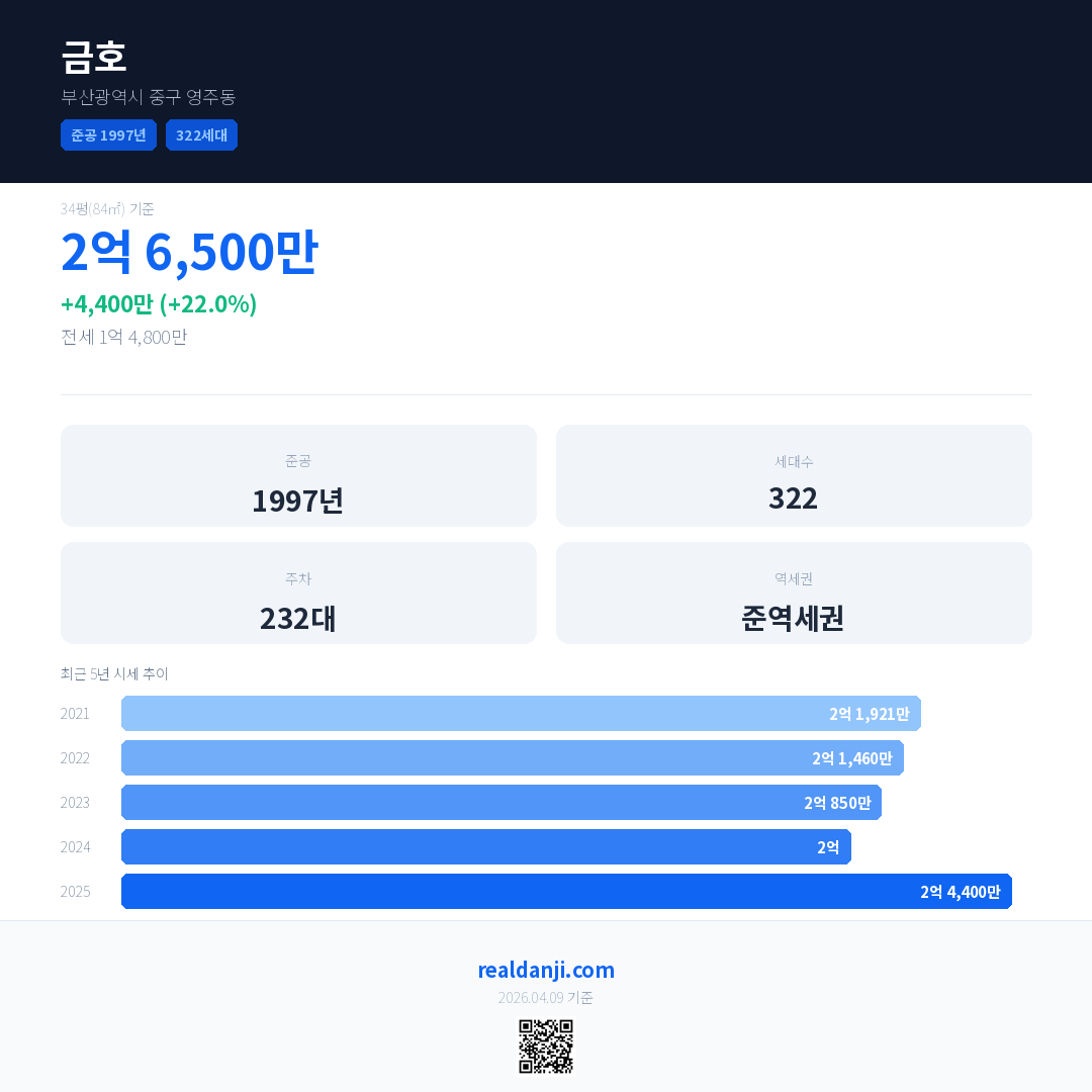 금호 국민평형 기준 2025년 평균 거래가는 2억 4,400만으로, 전년 대비 22.0% 상승 했습니다.