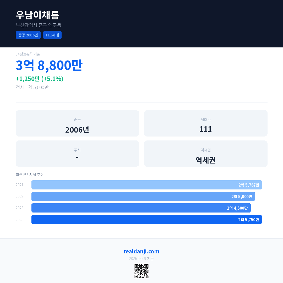우남이채롬 국민평형 기준 2025년 평균 거래가는 2억 5,750만으로, 전년 대비 5.1% 상승 했습니다.