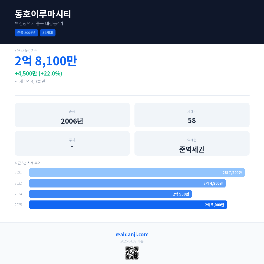 동호이루마시티은(는) 2006년에 준공되었으며, 현재 20년차입니다. 총 58세대 규모입니다.