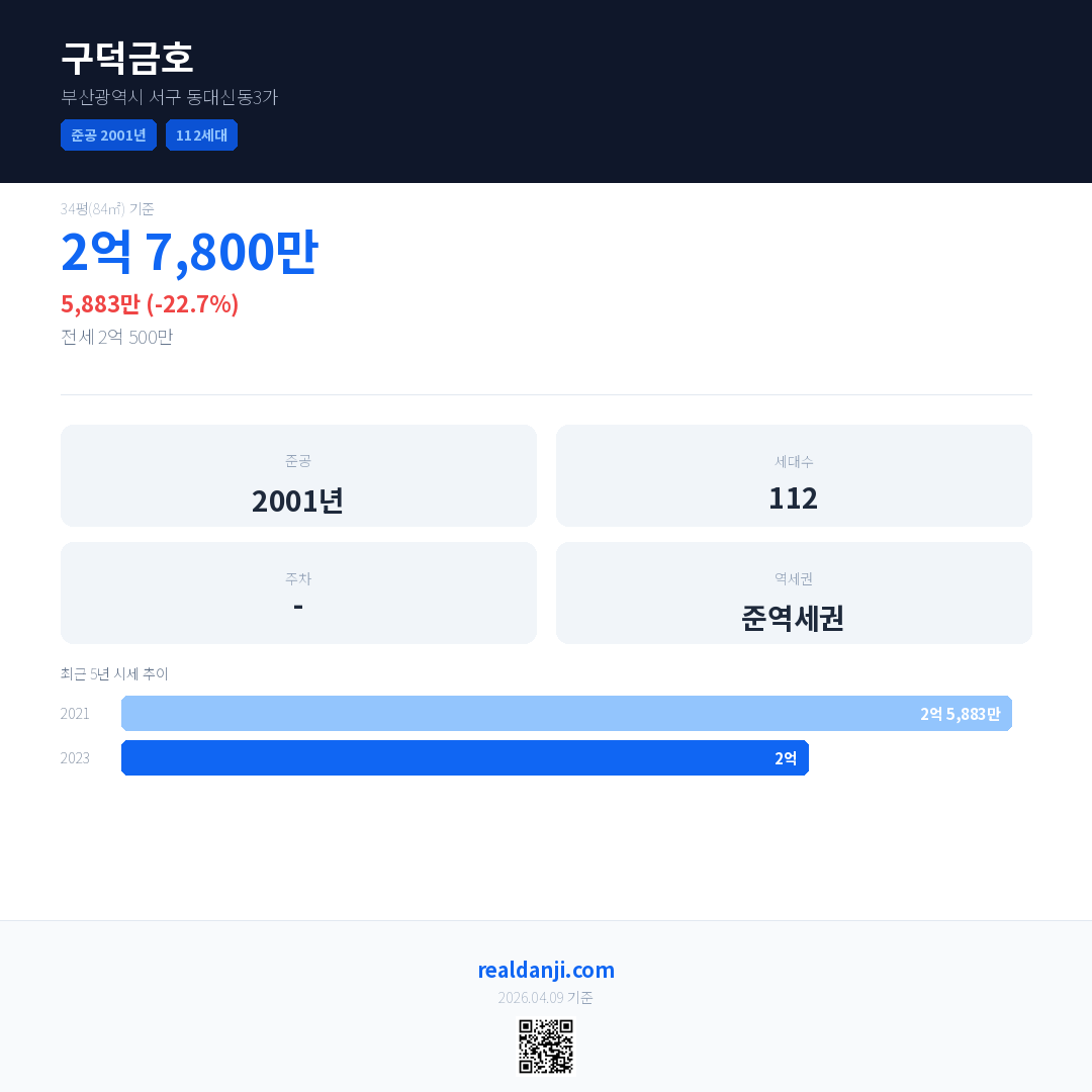 구덕금호은(는) 2001년에 준공되었으며, 현재 25년차입니다. 총 112세대 규모입니다.