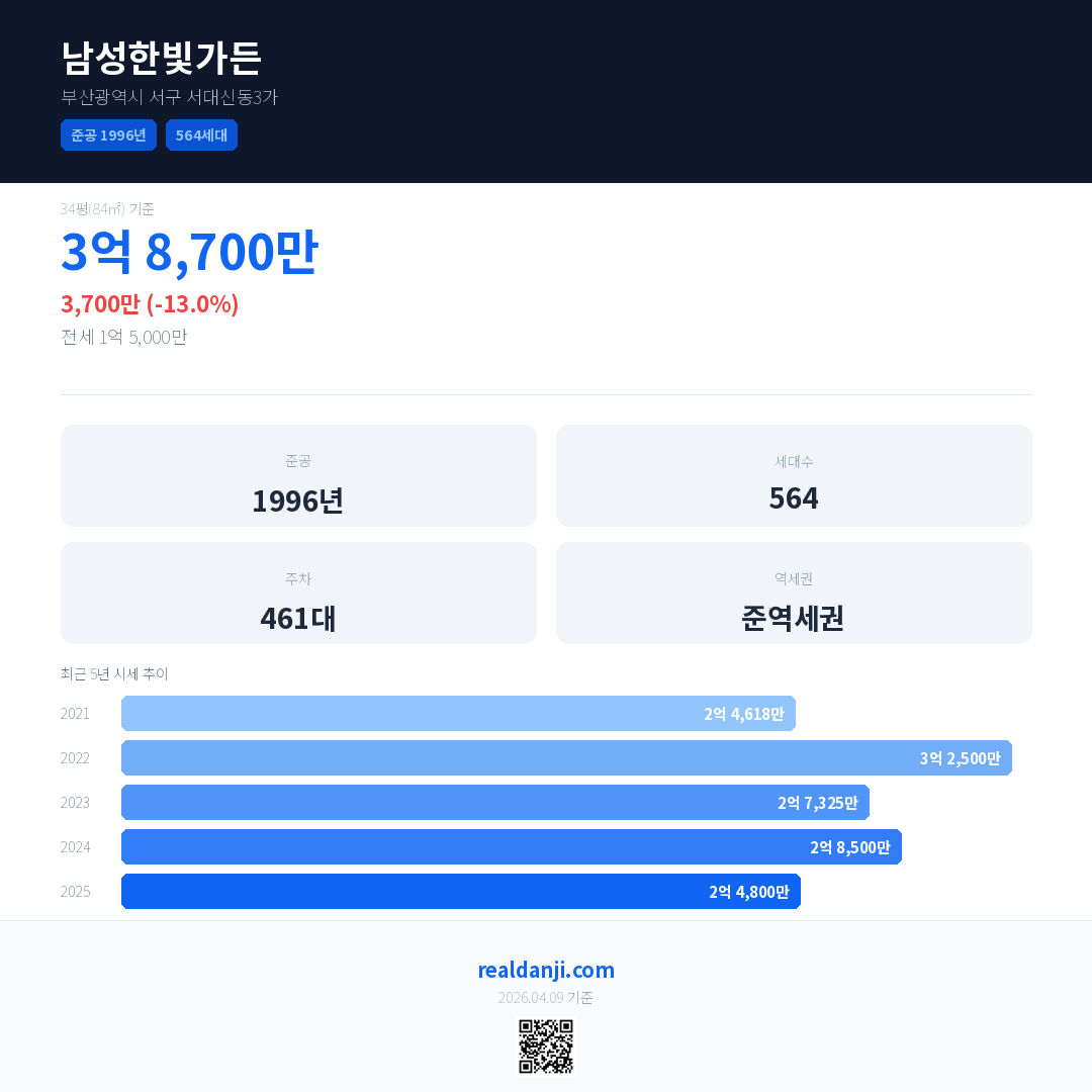 남성한빛가든 최근 거래가는 3억 8,700만입니다. (2026-03)