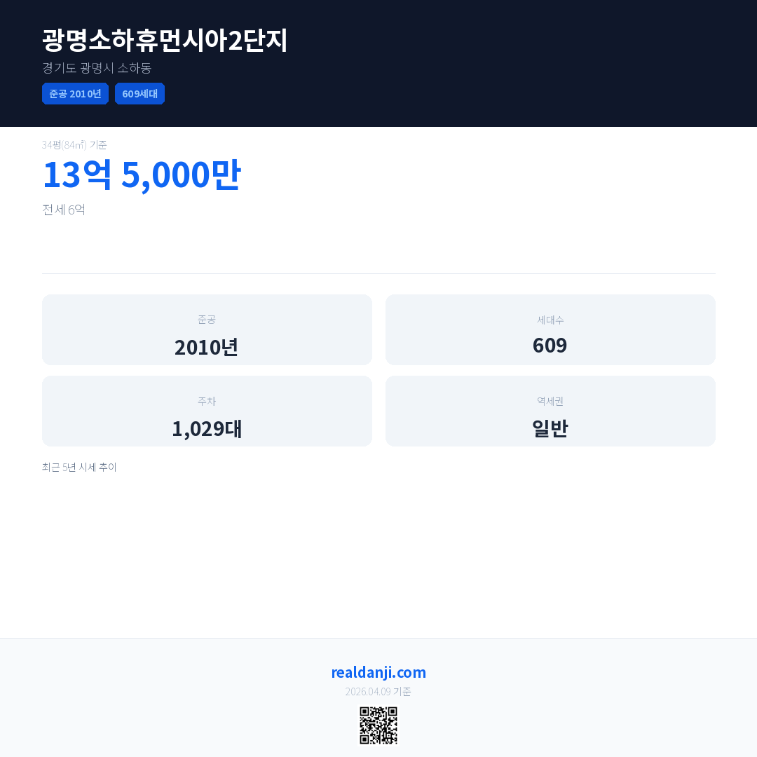 광명소하휴먼시아2단지 최근 거래가는 13억 5,000만입니다. (2026-03)