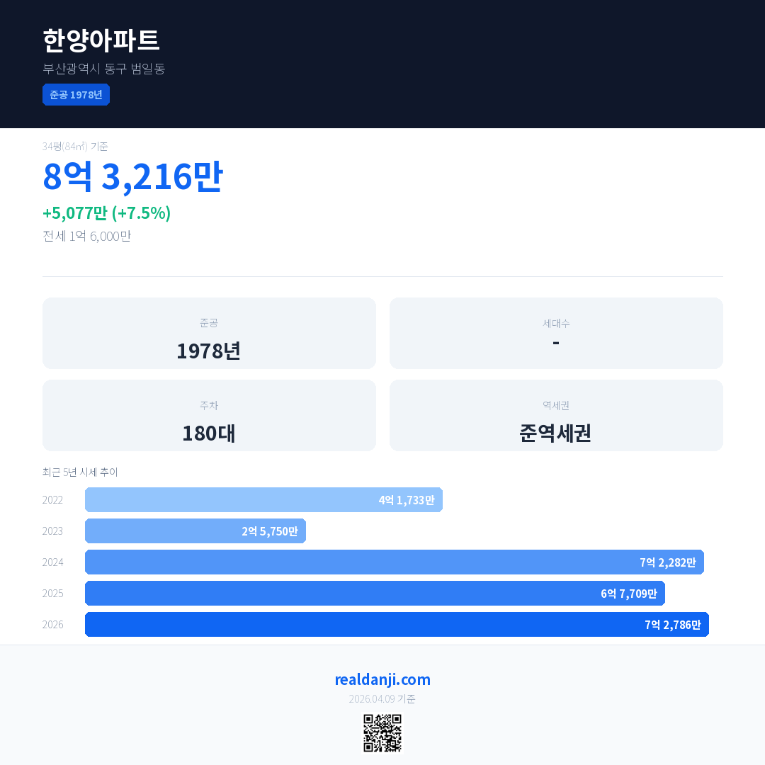 한양아파트 최근 거래가는 8억 3,216만입니다. (2026-03)