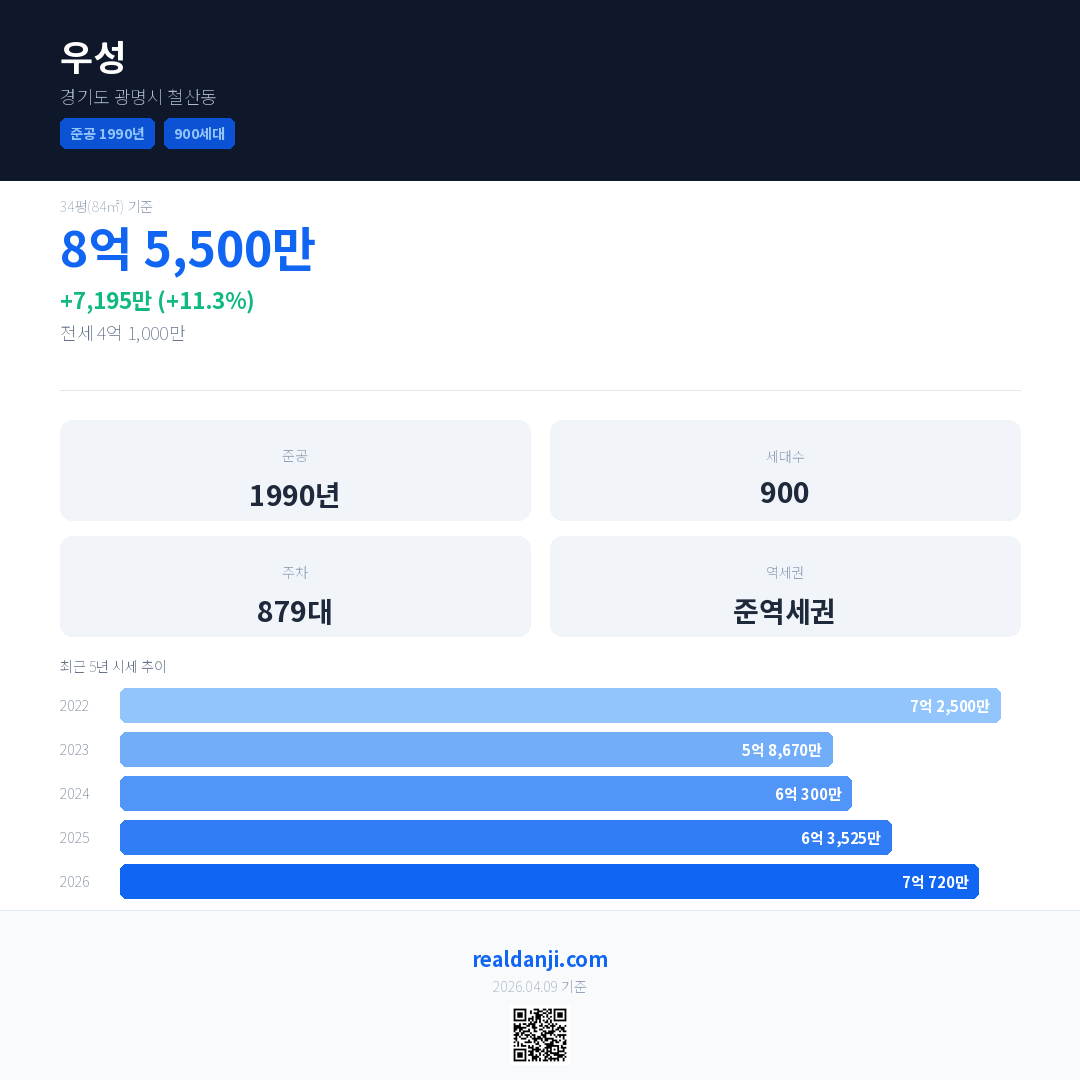 우성 국민평형 기준 2026년 평균 거래가는 7억 720만으로, 전년 대비 11.3% 상승 했습니다.