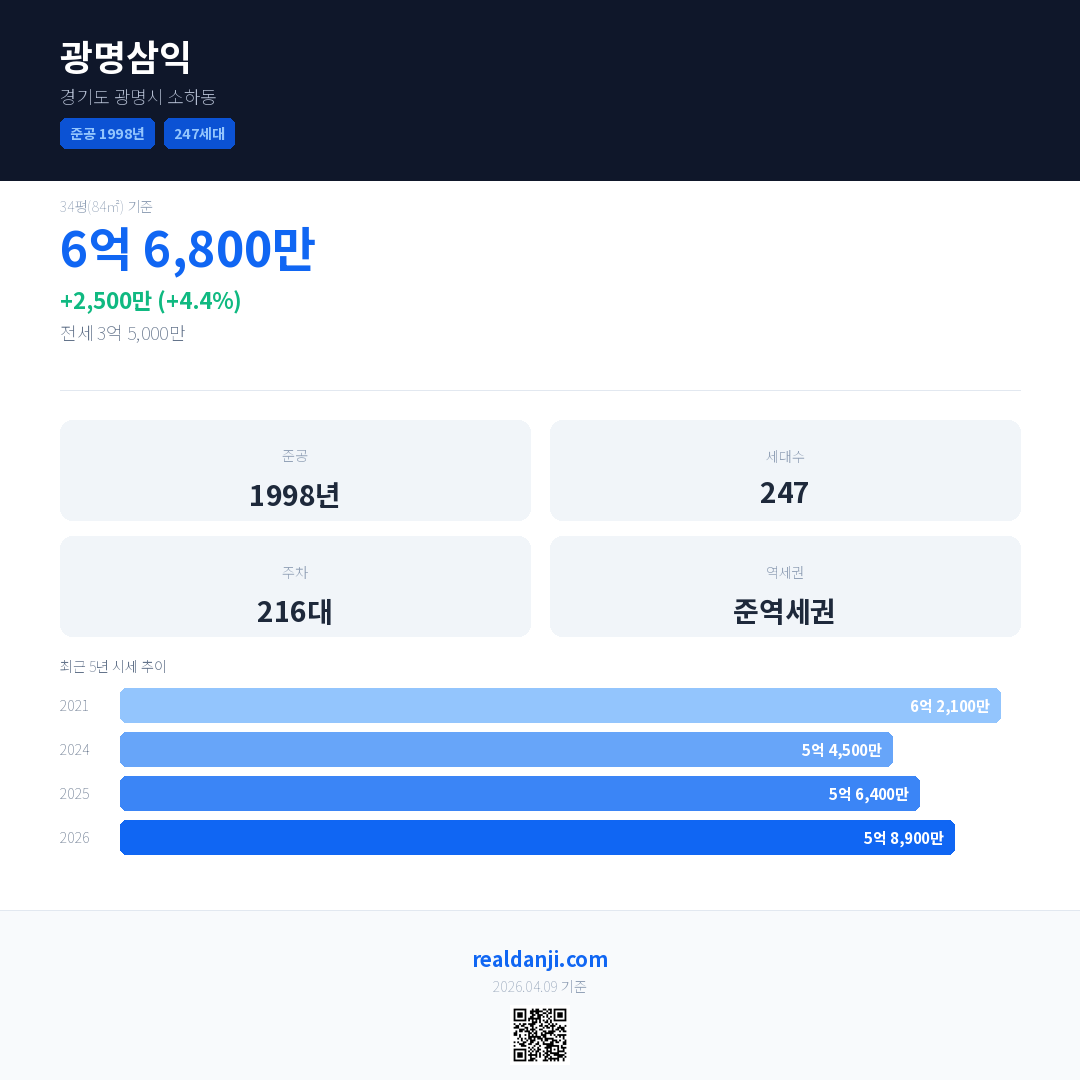 광명삼익 국민평형 기준 2026년 평균 거래가는 5억 8,900만으로, 전년 대비 4.4% 상승 했습니다.