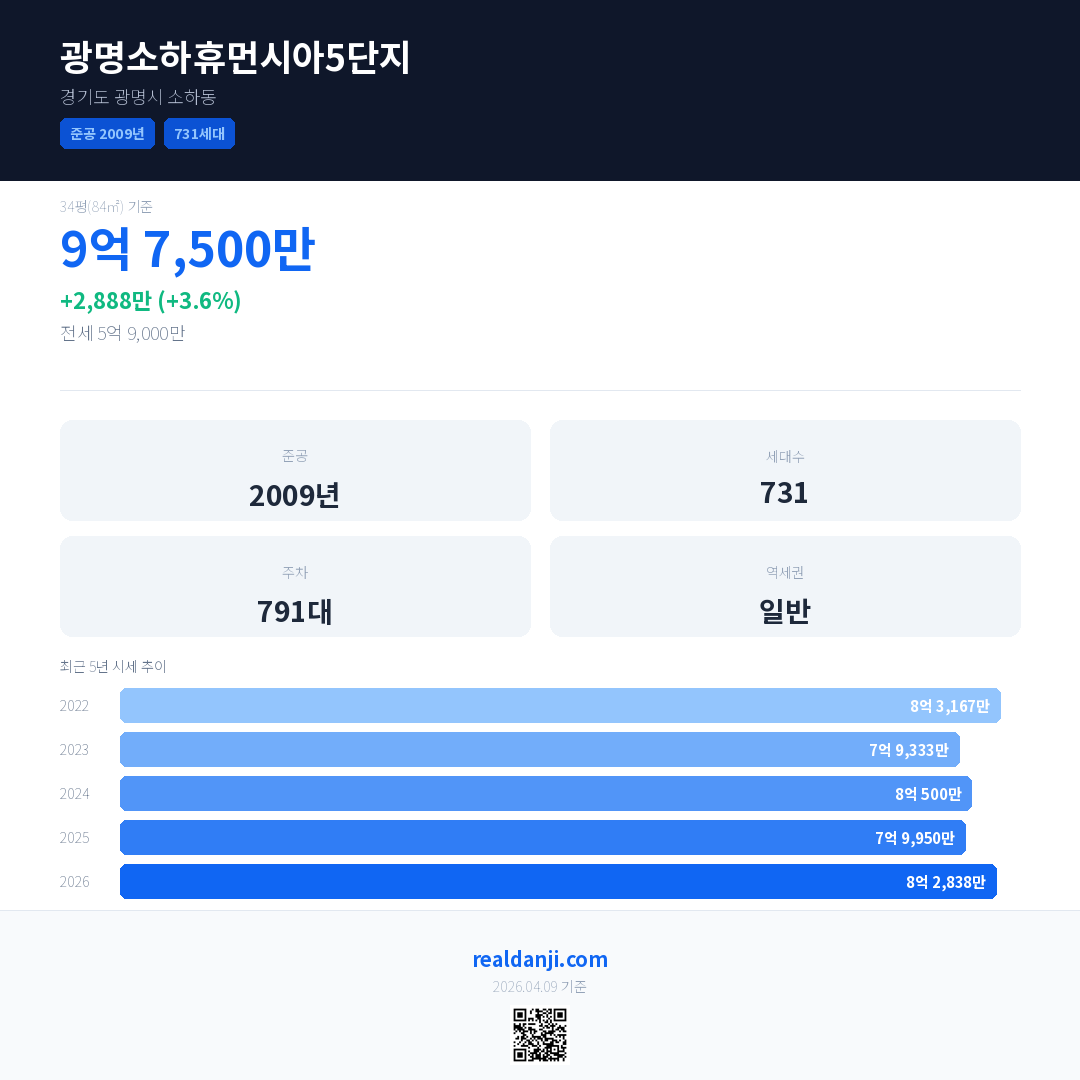 광명소하휴먼시아5단지 최근 거래가는 9억 7,500만입니다. (2026-04)