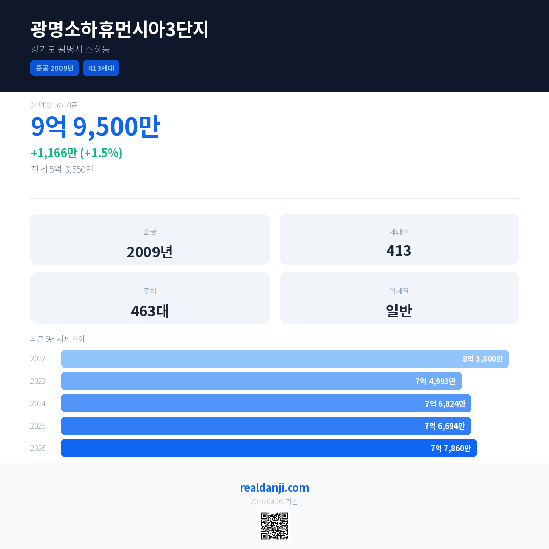광명소하휴먼시아3단지 최근 거래가는 9억 9,500만입니다. (2026-02)