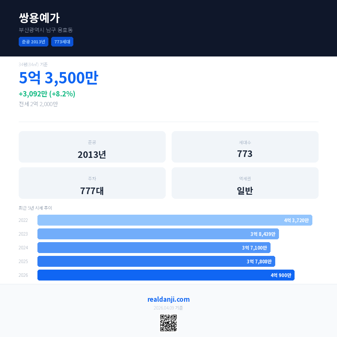 쌍용예가 국민평형 기준 2026년 평균 거래가는 4억 900만으로, 전년 대비 8.2% 상승 했습니다.