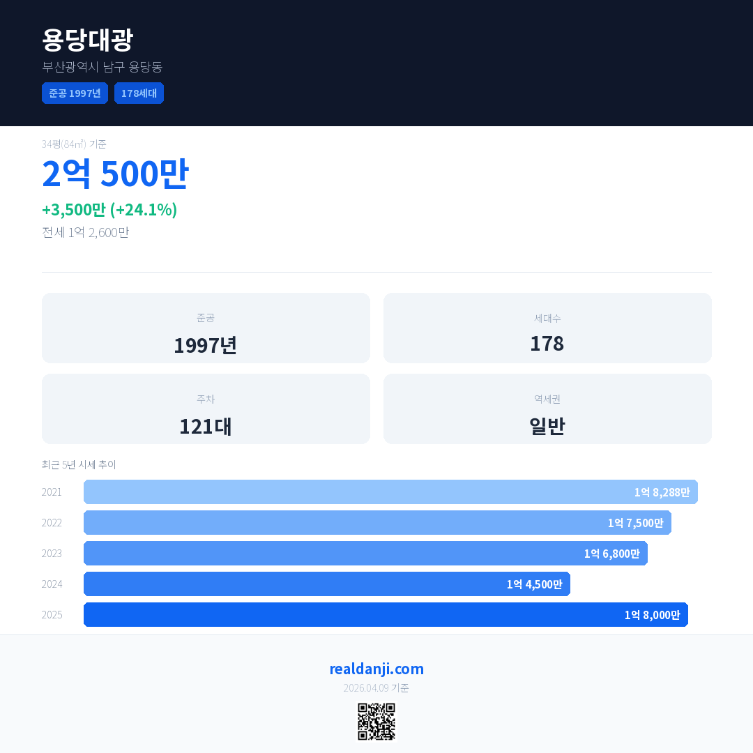 용당대광 국민평형 기준 2025년 평균 거래가는 1억 8,000만으로, 전년 대비 24.1% 상승 했습니다.