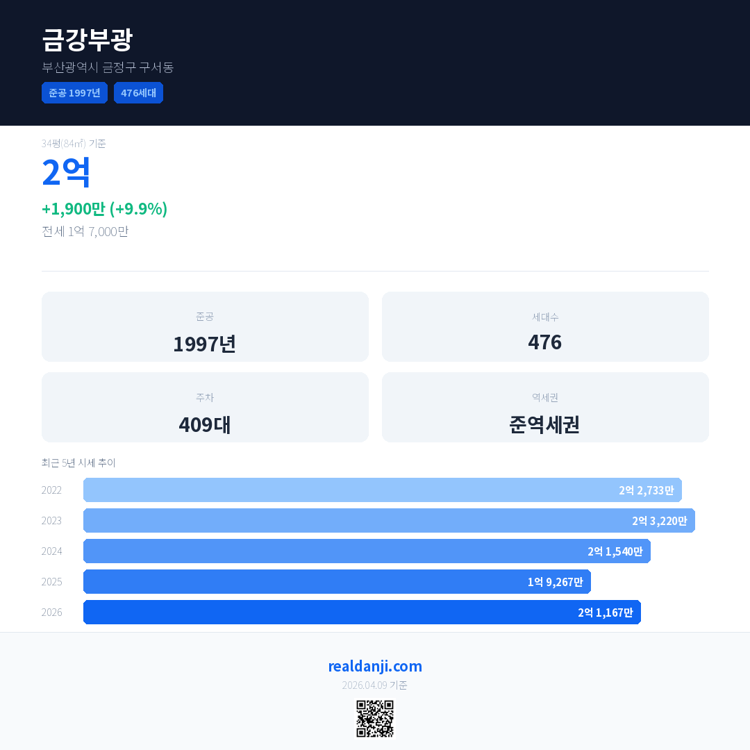 금강부광 국민평형 기준 2026년 평균 거래가는 2억 1,167만으로, 전년 대비 9.9% 상승 했습니다.