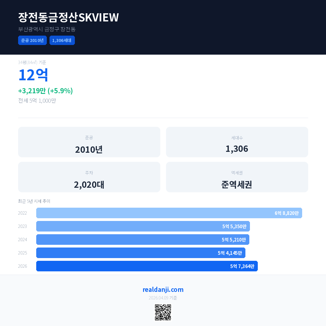 장전동금정산SKVIEW 최근 거래가는 12억입니다. (2026-04)