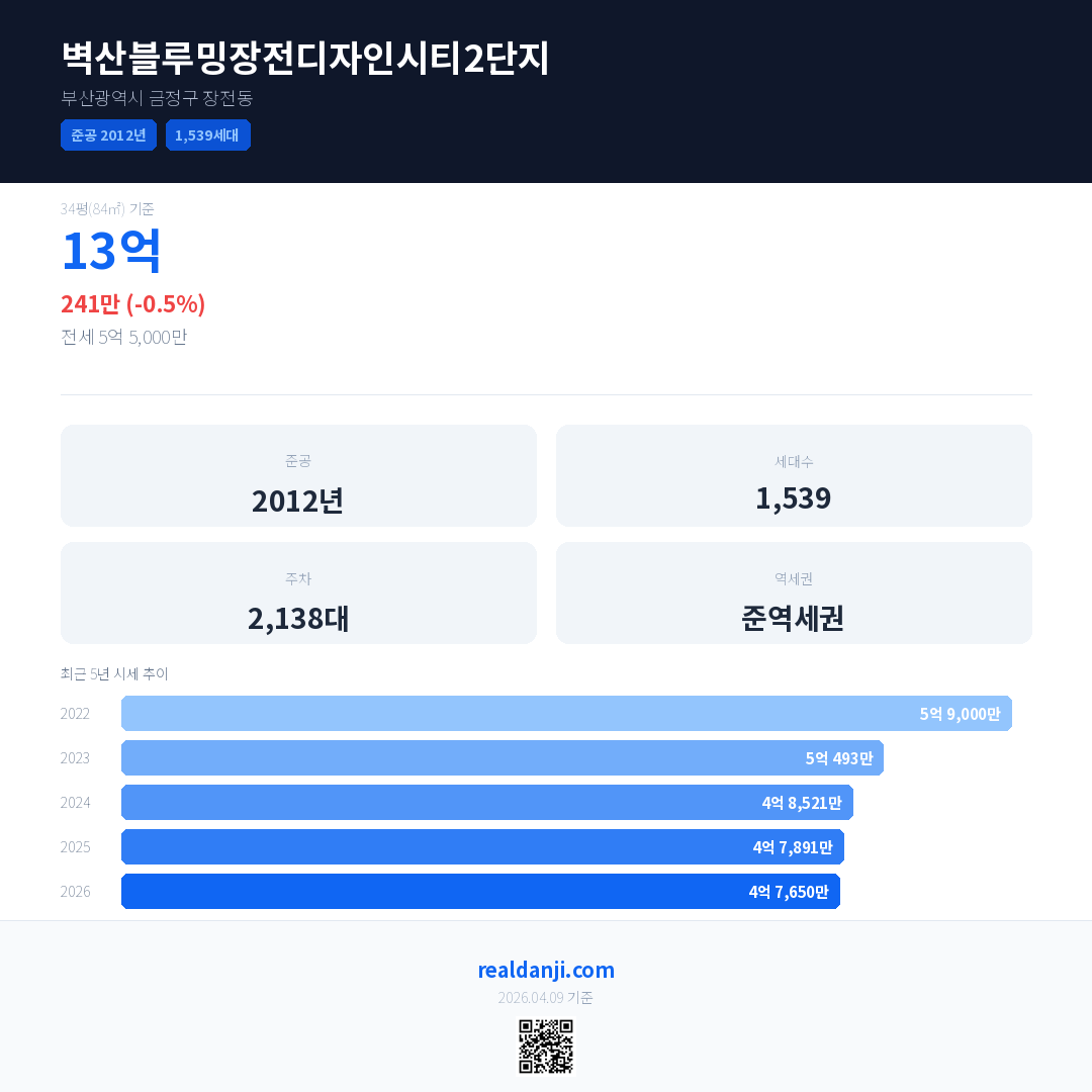 벽산블루밍장전디자인시티2단지 최근 거래가는 13억입니다. (2026-04)