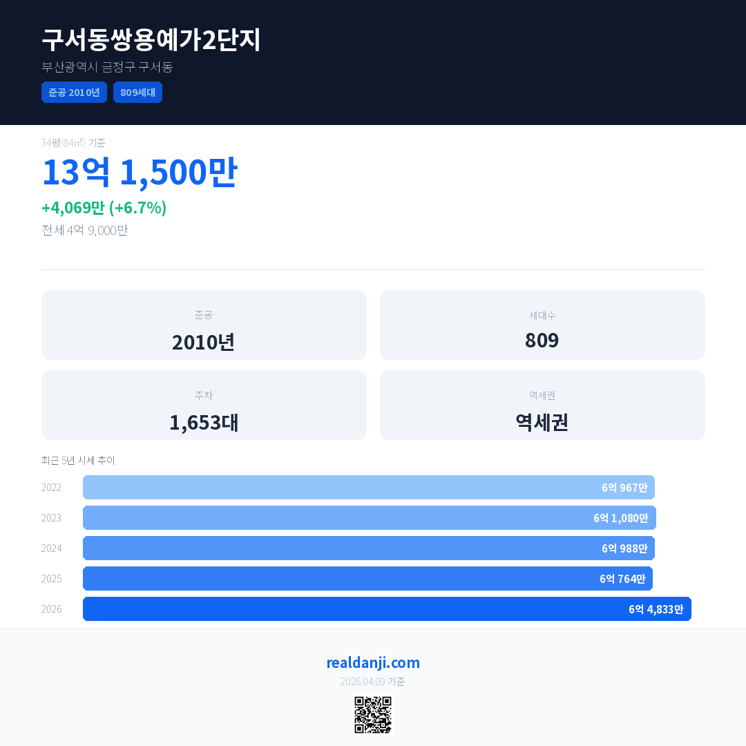 구서동쌍용예가2단지 국민평형 기준 2026년 평균 거래가는 6억 4,833만으로, 전년 대비 6.7% 상승 했습니다.