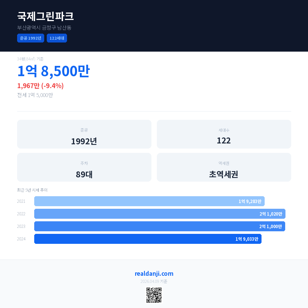 국제그린파크 국민평형 기준 2024년 평균 거래가는 1억 9,033만으로, 전년 대비 9.4% 하락 했습니다.