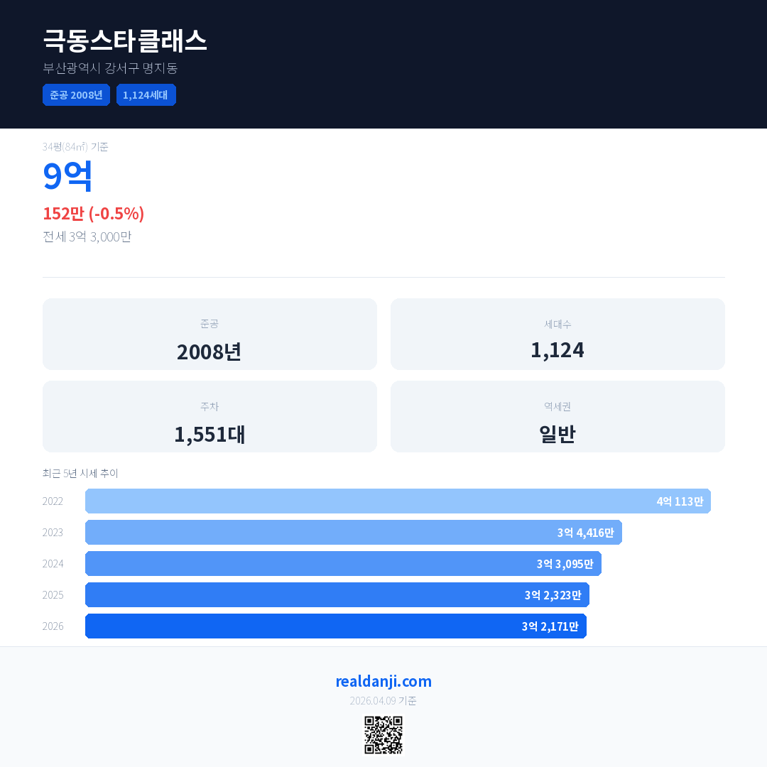 극동스타클래스 최근 거래가는 9억입니다. (2026-03)