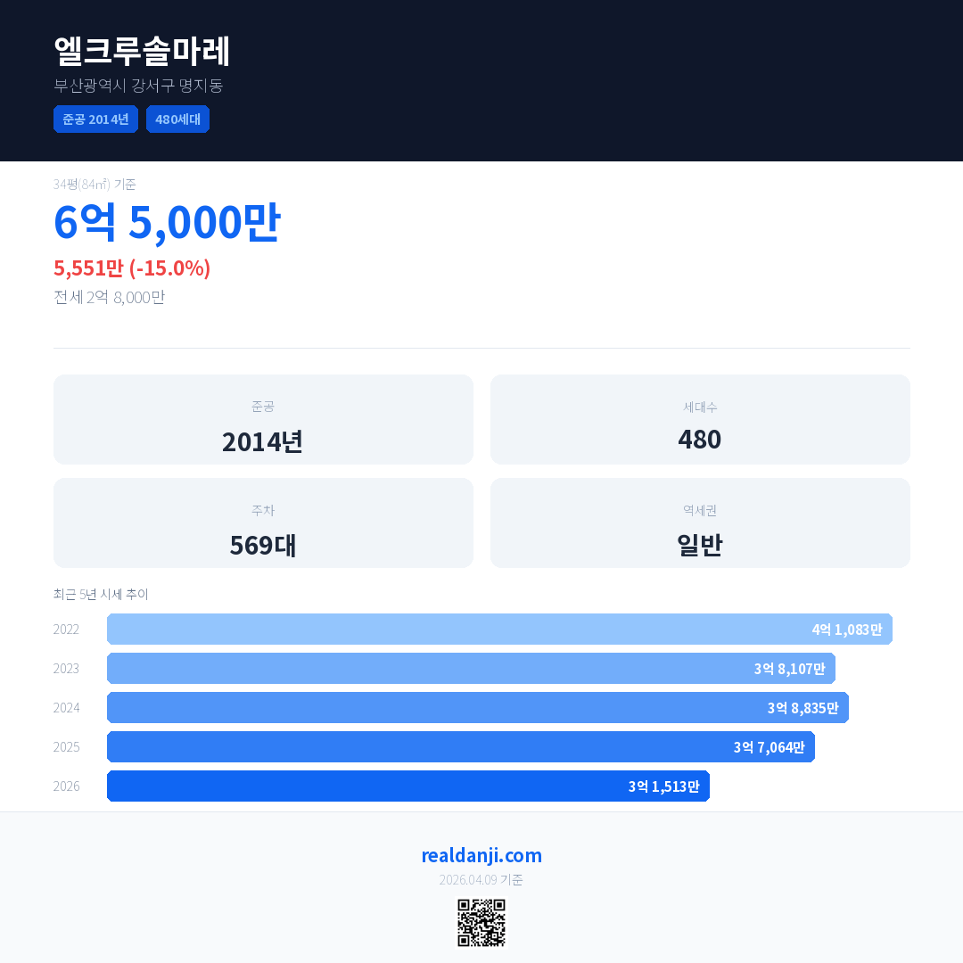 엘크루솔마레 국민평형 기준 2026년 평균 거래가는 3억 1,513만으로, 전년 대비 15.0% 하락 했습니다.