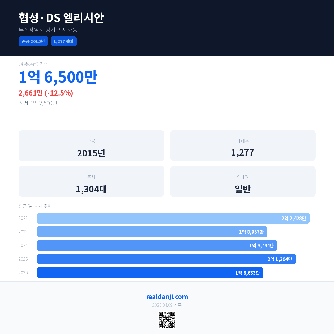 협성·DS 엘리시안 국민평형 기준 2026년 평균 거래가는 1억 8,633만으로, 전년 대비 12.5% 하락 했습니다.