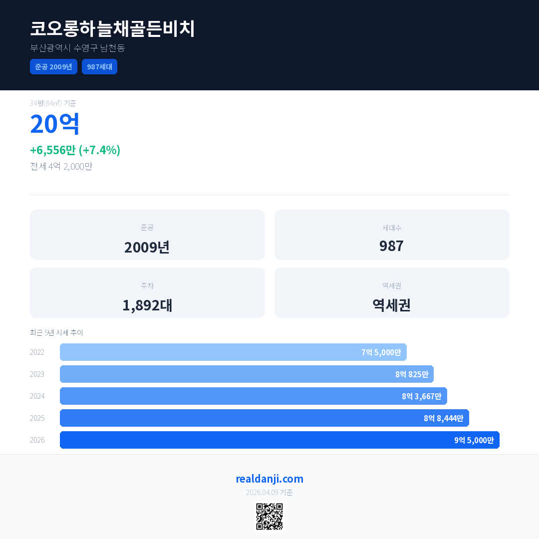 코오롱하늘채골든비치 최근 거래가는 20억입니다. (2026-02)