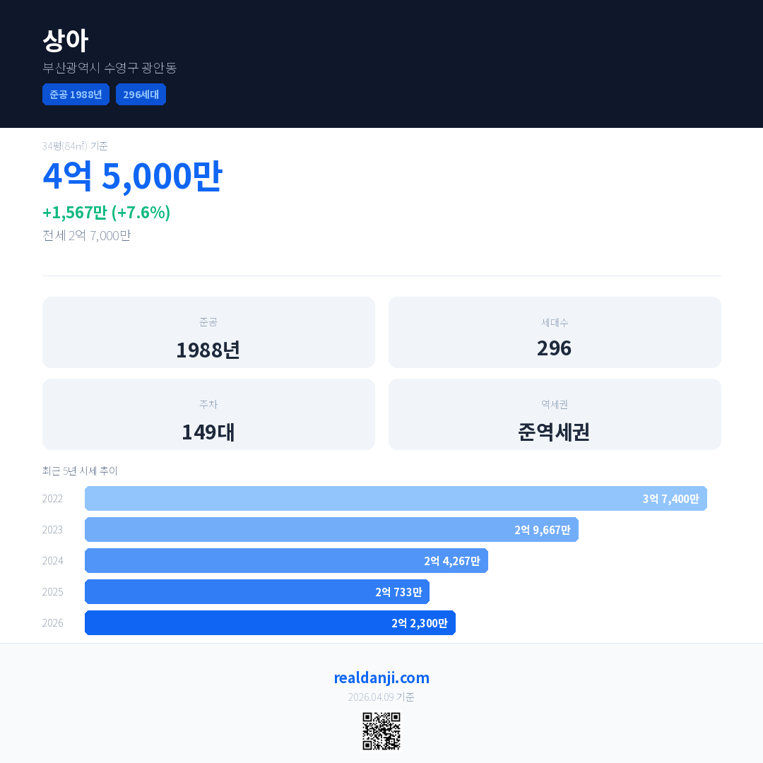 상아은(는) 1988년에 준공되었으며, 현재 38년차입니다. 총 296세대 규모입니다.