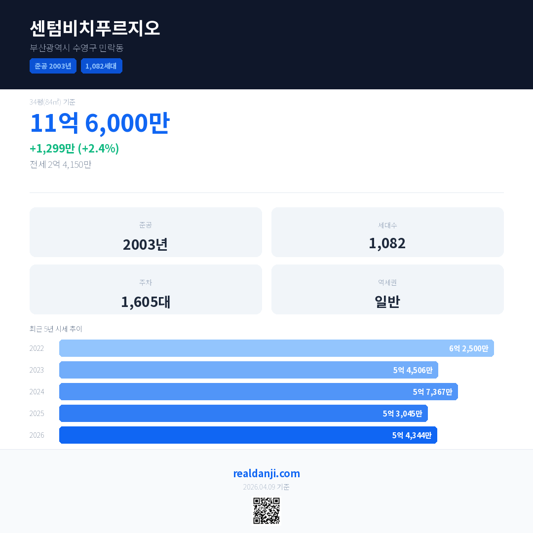 센텀비치푸르지오 국민평형 기준 2026년 평균 거래가는 5억 4,344만으로, 전년 대비 2.4% 상승 했습니다.